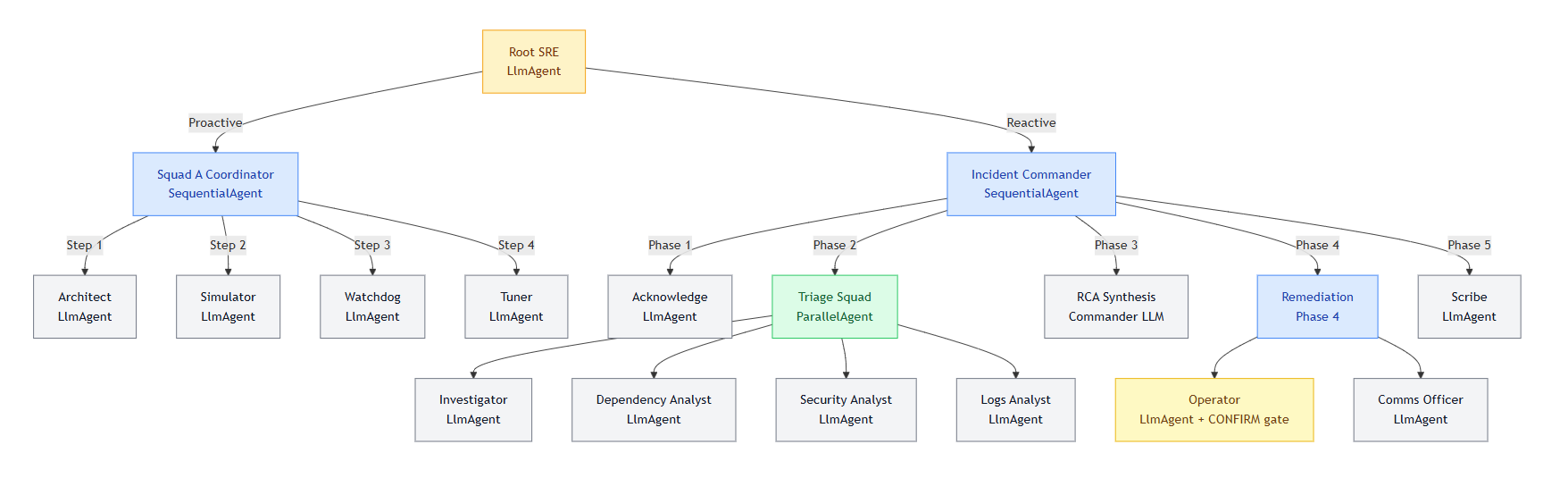 Handles reactive P1/P2 incident response via a strict 5-phase SequentialAgent pipeline.
